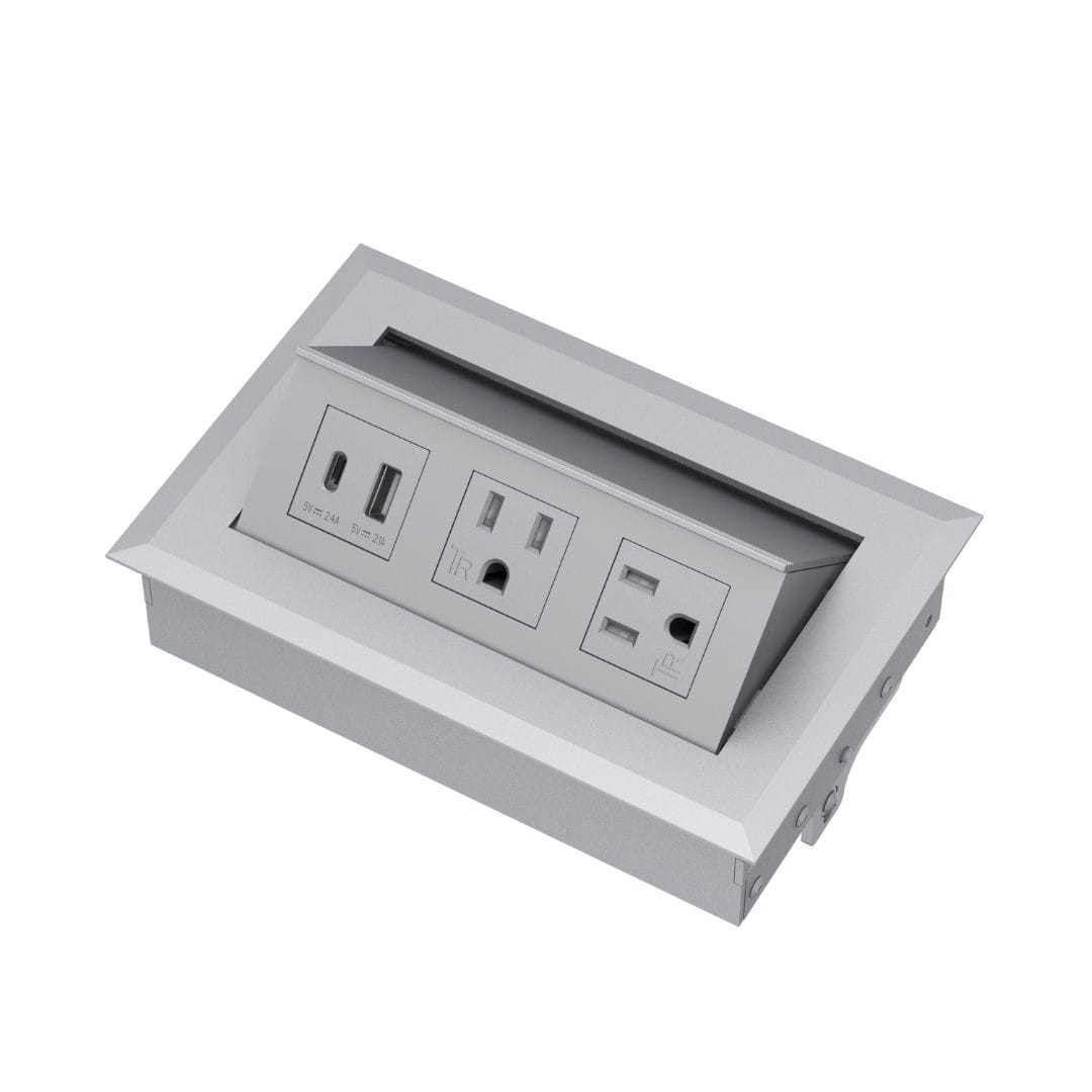 It opens smoothly by simply pressing down on the lid revealing convenient power and/or communication couplers. Closes easily to be hidden from view when not in use.